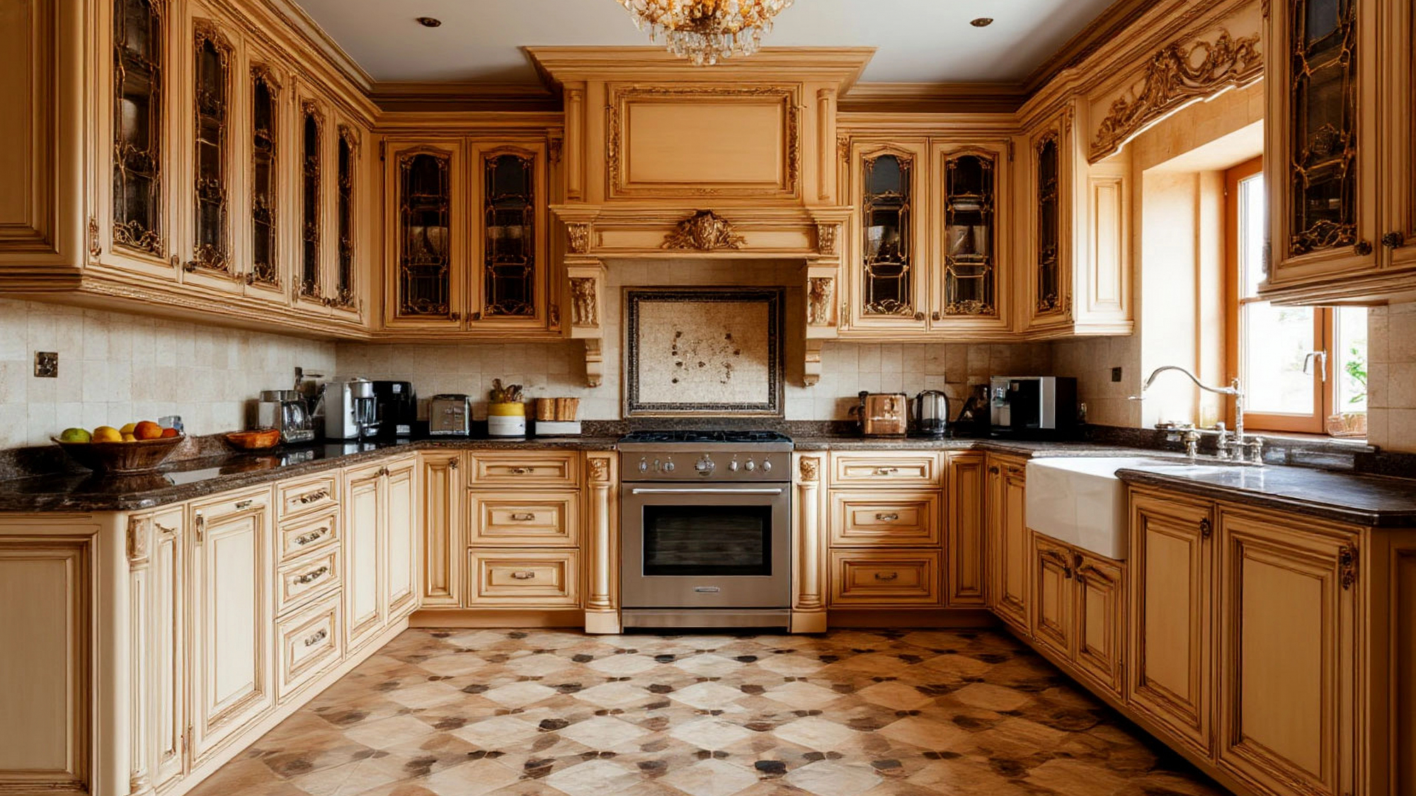 Особое внимание заслуживает отделка фасадов. Обрамления выполнены с филигранной точностью, а позолота нанесена вручную — мастерская работа, которая делает каждую кухню уникальной. Изящные резные элементы подчёркивают линии, а тонкая золотая кайма на стыках рам добавляет глубину и игру света. Когда дневное солнце скользит по фасадам, кухня словно оживает — золото мягко переливается, а тёплые бежево-кремовые тона древесины приобретают янтарный оттенок.